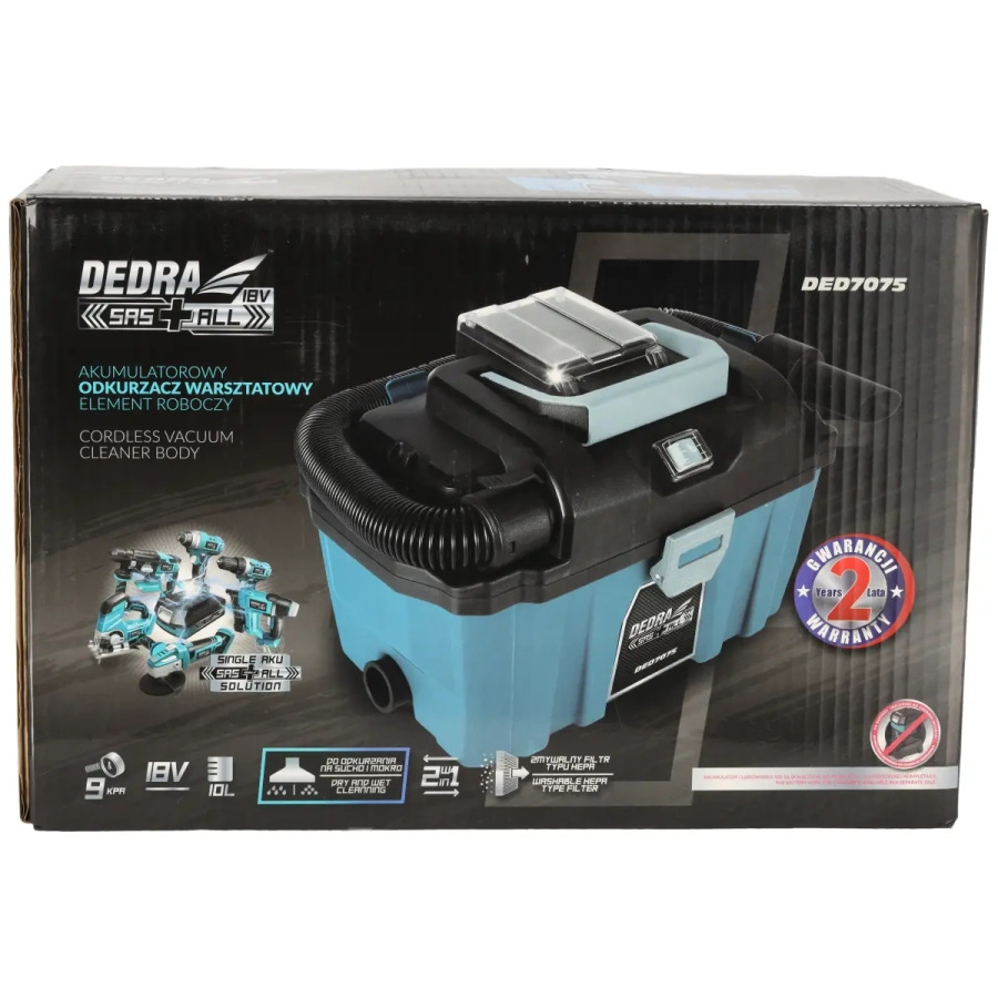 Vákuum: 9 kPa, objem nádrže: 10 l, obsahuje umývateľný Hepa filter, kolieska, kefu na čalúnenie, štrbinovú hubicu, flexibilnú hadicu 0,7 m - 2,8 m, redukciu na elektrické náradie