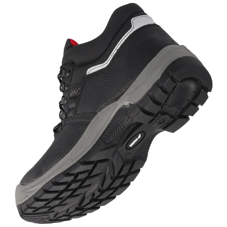Materiál: hovädzia koža; certifikát CE; norma EN ISO 20345:2011; podrážka s dvojitou hustotou PU/PU; oceľová špička; oceľová medzipodrážka; podrážka odolná proti elektrostatickým vplyvom/olejom