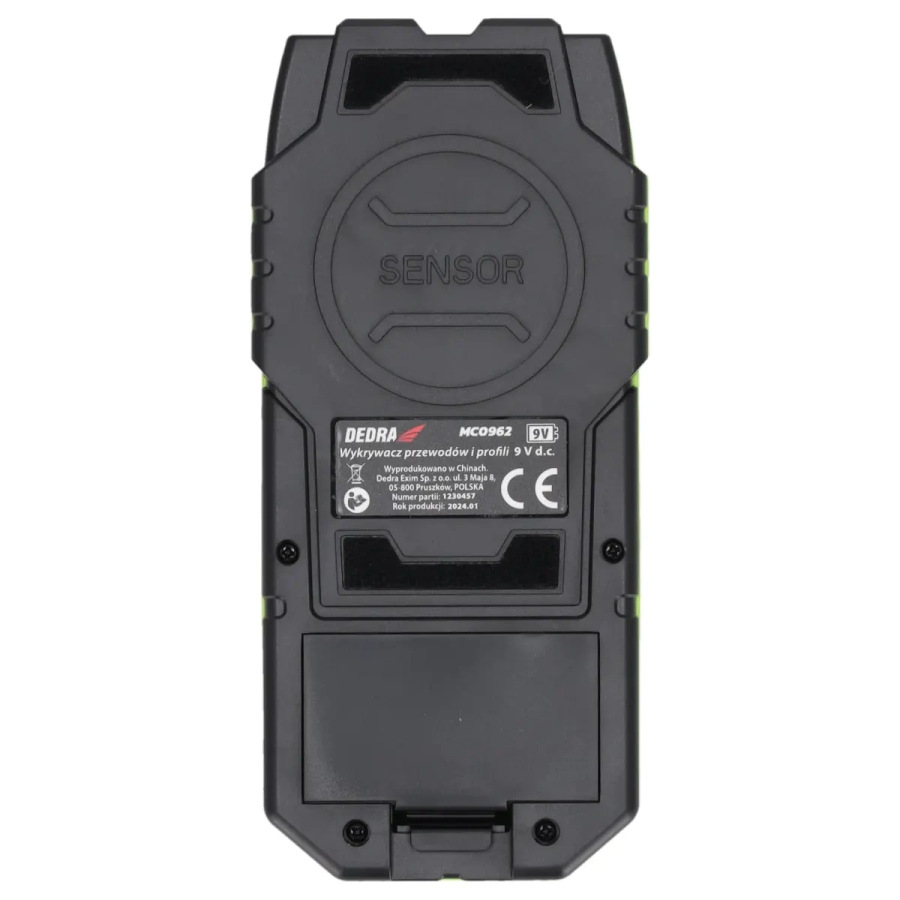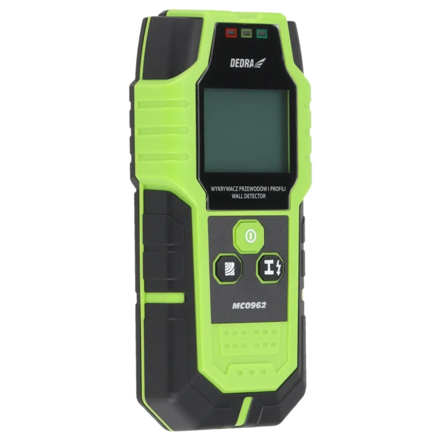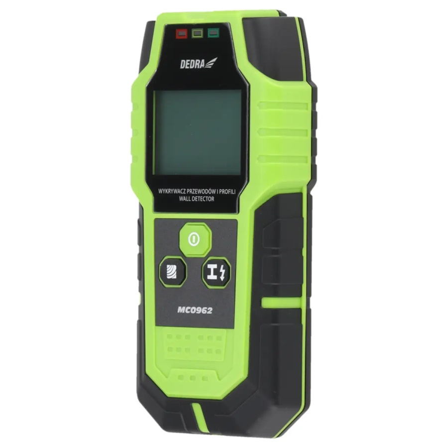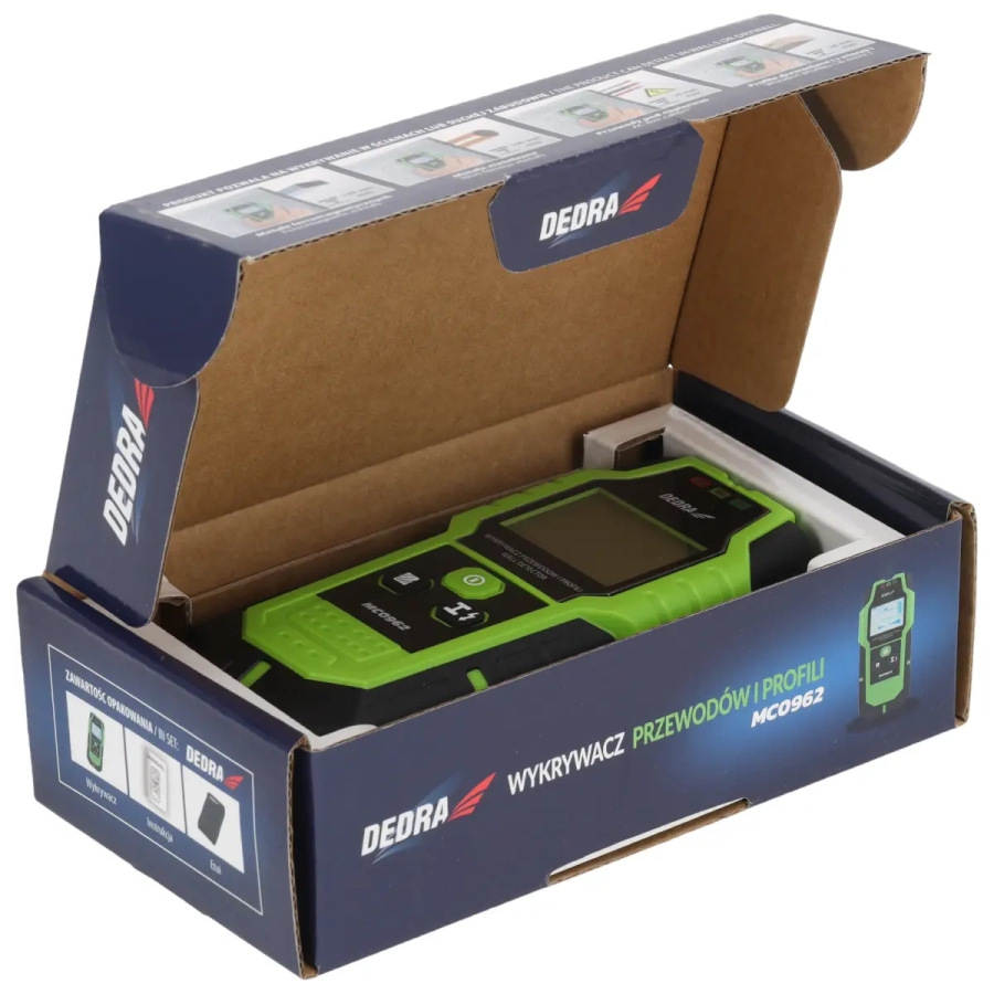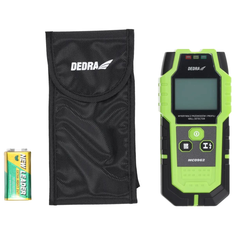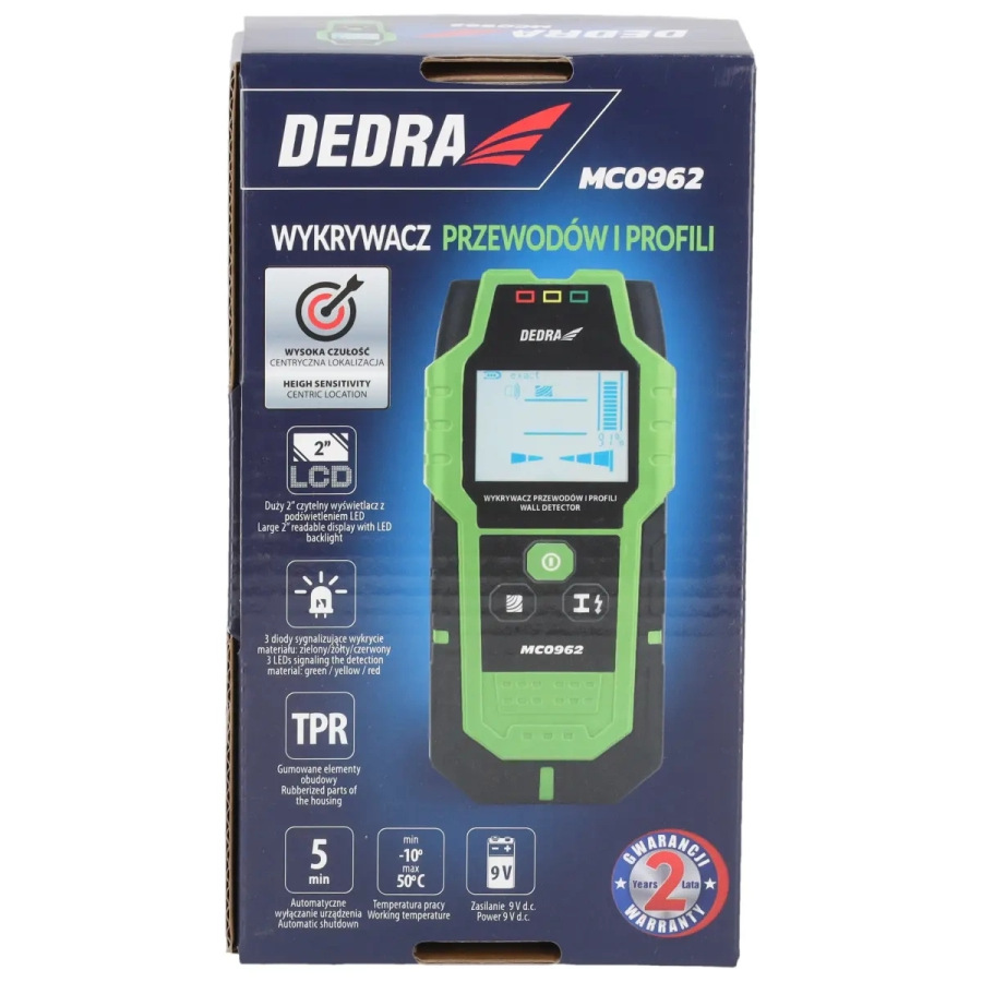 Napájanie: 9 V DC (6F22); displej: 2" LED; max. hĺbka detekcie: vodiče-50 mm/feromagnetické kovy-100 mm/neželezné kovy-80 mm/drevené časti-20-38 mm; zvukový alarm; vysoká citlivosť