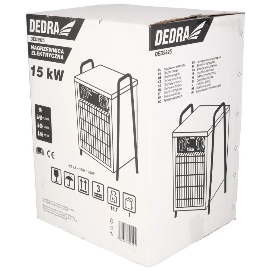 Výkon: 5000W/10000W/15000W; prietok vzduchu 1290m³/h; 3-fázová zásuvka 400V; ochrana proti prehriatiu; termostat; 3 prevádzkové režimy: chladný/teplý/horúci