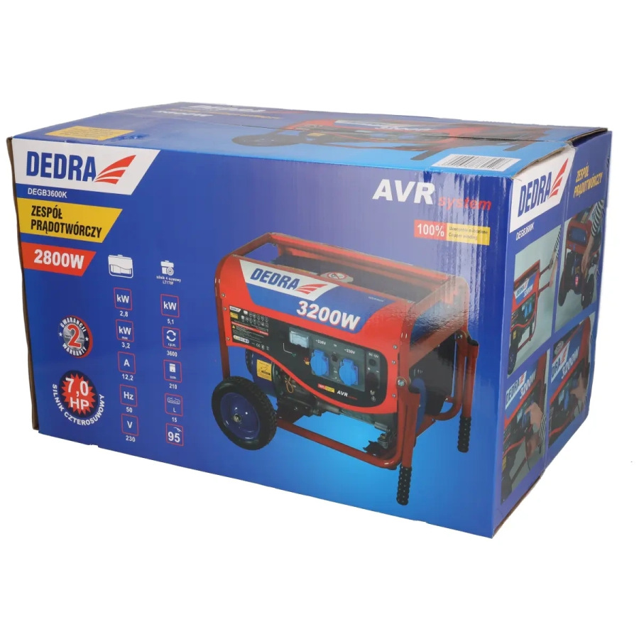 Maximálny výkon 3200 W, výkon pri stálej práci 2800 W, systém AVR udržujúci správne výstupné napätie, 2 zásuvky 230 V, 1 zásuvka 12 V, palivová nádrž 15 l, prepravné kolieska
