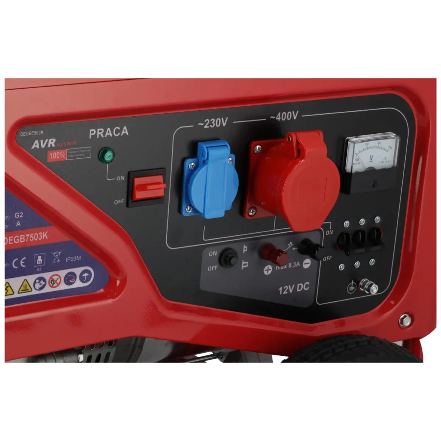 Maximálny príkon 6500 W, výkon pri stálej práci 6000 W, výkon motora 11 HP, systém AVR udržujúci správne výstupné napätie, 2 zásuvky 230 V, 1 zásuvka 400 V, palivová nádrž 25 l, prepravné kolieska