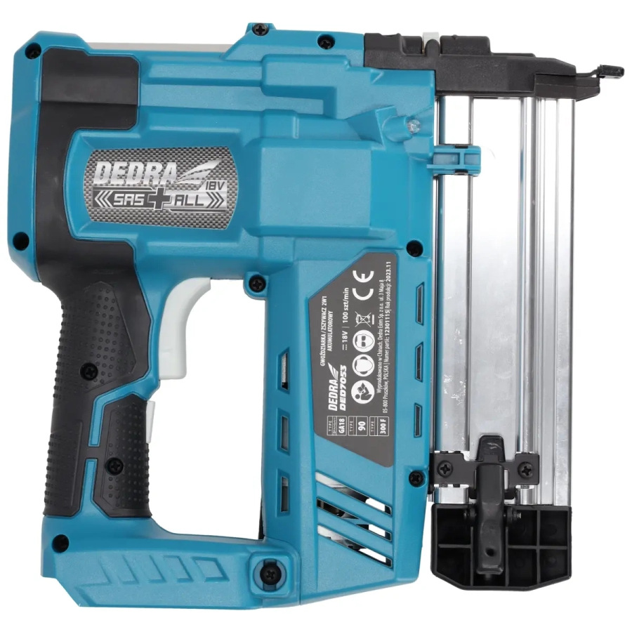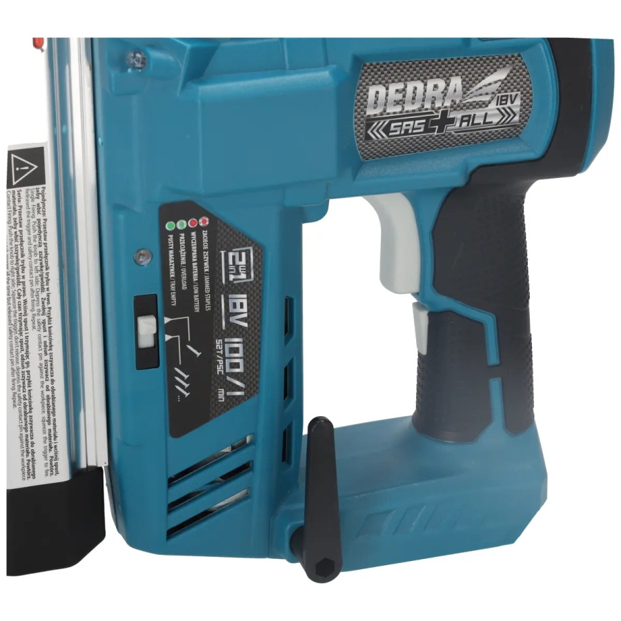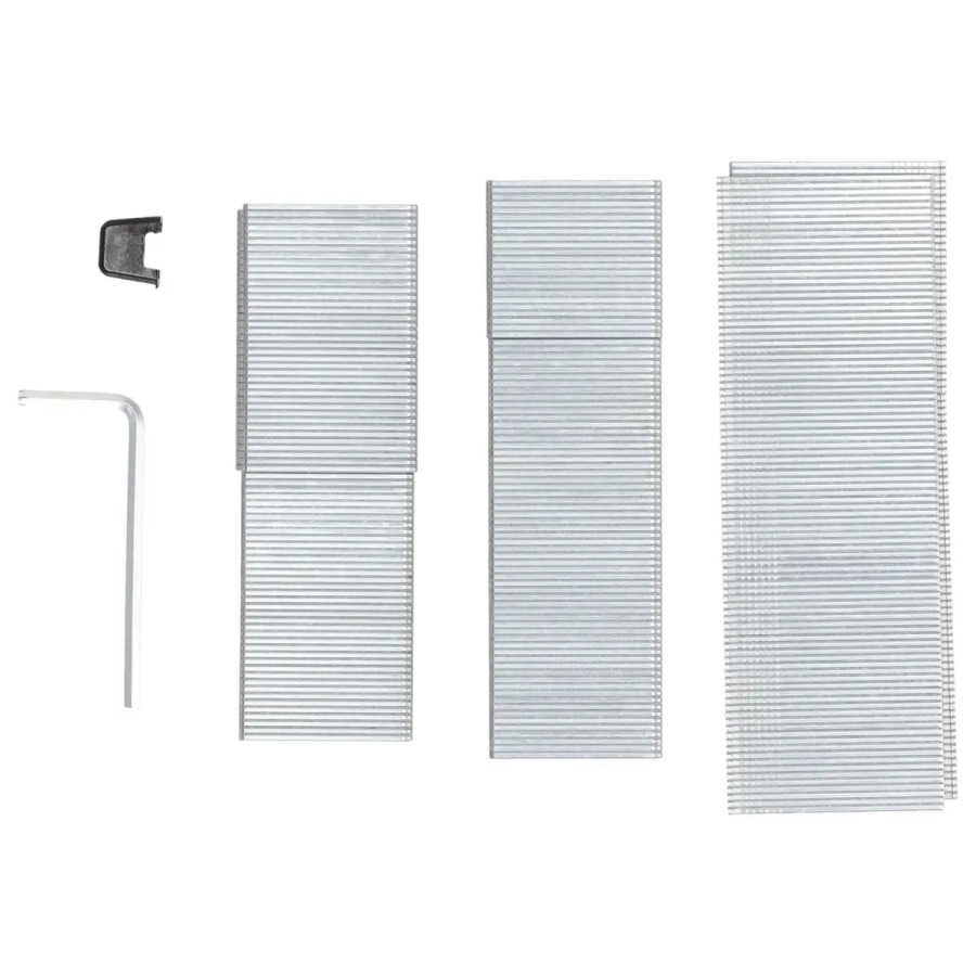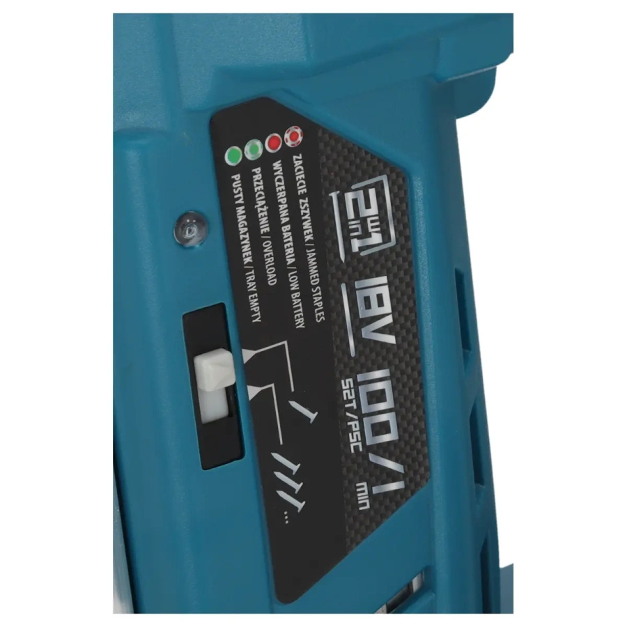 Poradí si so sponkami a klincami, zabudovaný kompresor pre vysokú hnaciu silu a rýchlosť, nastavenie hnacej sily, veľkokapacitný zásobník (100 kusov), LED osvetlenie - dve svietiace LED diódy, ochrana proti náhodnému použitiu