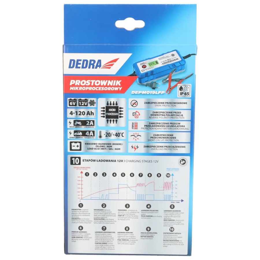 LCD displej, zimný režim nabíjania, určený na nabíjanie 6V/12V mokrých, gélových, AGM, LFP (lítium-ión-fosfátových) batérií s kapacitou 4-120Ah, nabíjací prúd 2A-4A, 10 stupňov nabíjania, stupeň ochrany IP65, kompaktné rozmery.