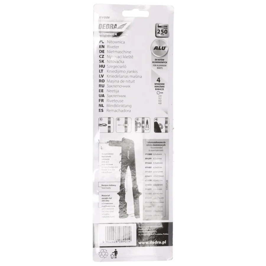 Materiál: hliník/PVC/chróm-molybdénová oceľ (20CrMo); dĺžka ramena: 2500 mm; priemer nitu: 2,4-4,8 mm; 4 vymeniteľné pracovné hroty