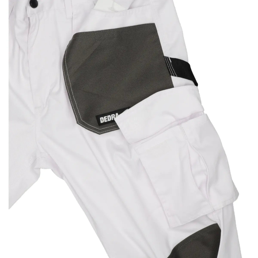 Biely, 80 % polyester, 20 % bavlna, 190 g/m² džínsovina, vystuženie na kolenách a vreckách, nastavenie v páse gombíkmi, trojité švy na nohaviciach, 9 vreciek (z toho 6 zapínaných suchým zipsom), slučka na kladivo, očko na kľúče