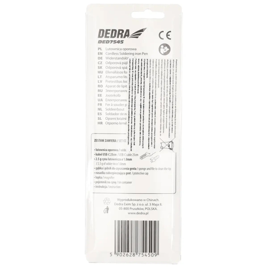 Napájanie: 4 V / 36 W, lítium-iónová batéria 4 V / 2000 mAh, čas zahrievania: 6s, prevádzkový čas: 40 min, čas nabíjania: 3-4 hodiny, maximálna teplota ohrevu: 450°C. Súčasťou balenia je: 25 mm kábel USB-C, 2,5 g spájkovacieho cínu ø1,0 mm, špongia na čistenie spájkovacieho hrotu, pilník na čistenie spájkovacieho hrotu