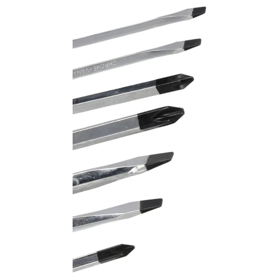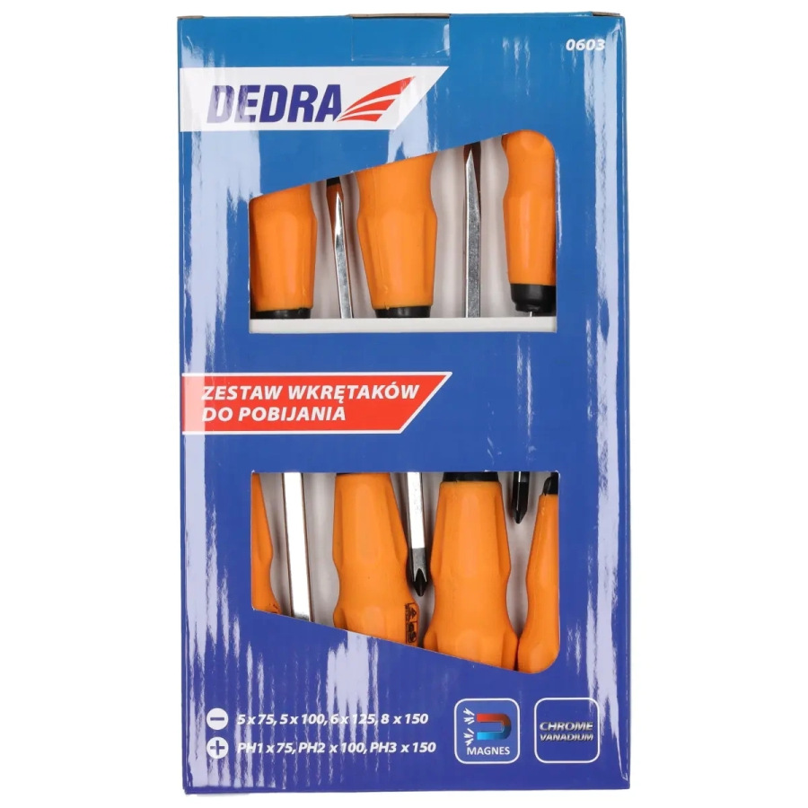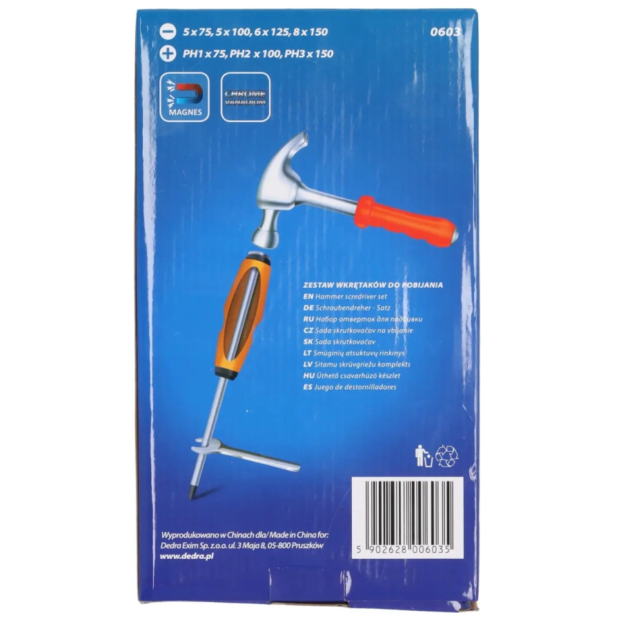 Materiál: CrV oceľ (PP rukoväť); magnetické hroty; sada: SL7x75/SL5x100/SL6x125/SL8x150/PH1x75/PH2x100/PH3x150