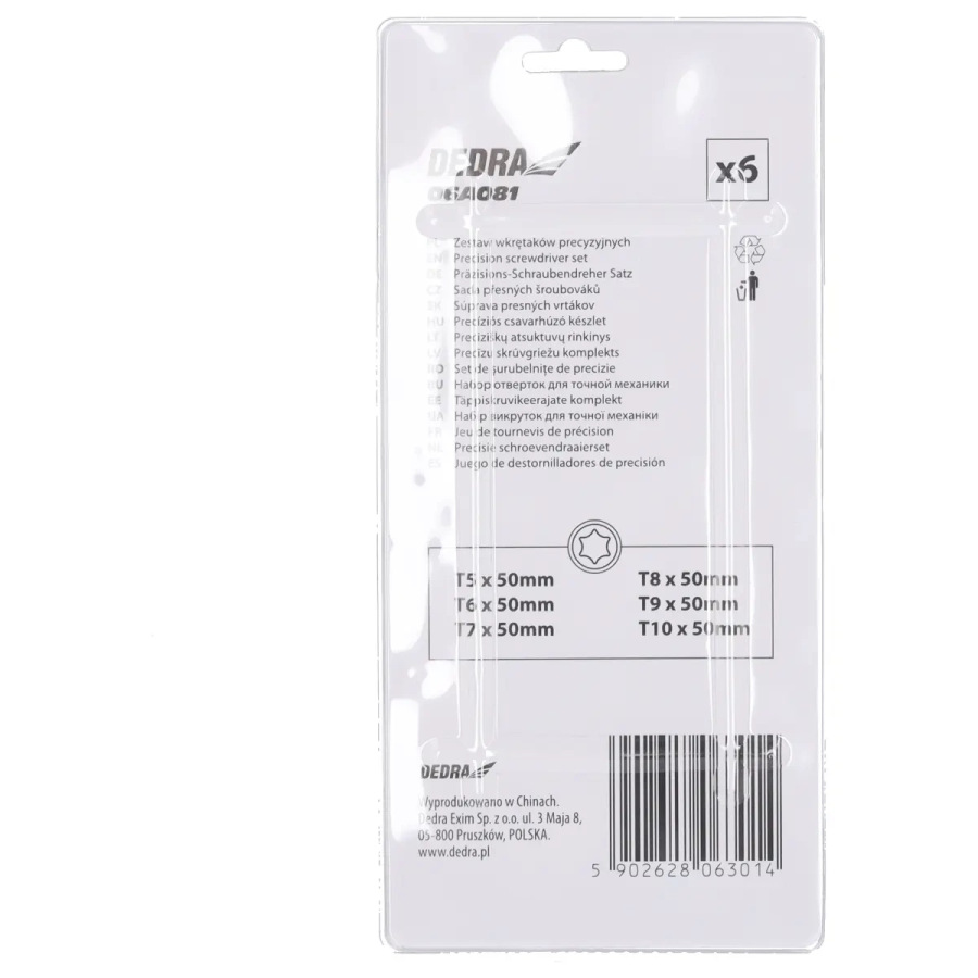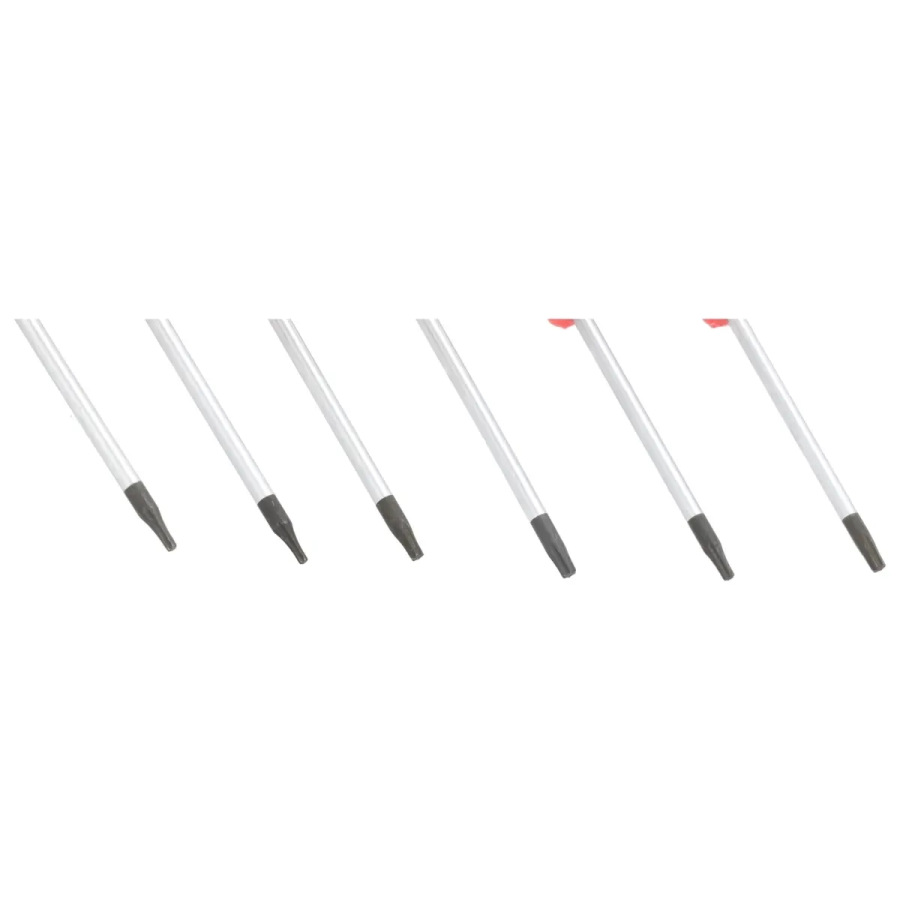 Materiál: CrV oceľ; magnetické bity; plastová škatuľa; sada: T5X50mm/T6X50mm/T7X50mm/T8X50mm/T9X50mm/T10X50mm