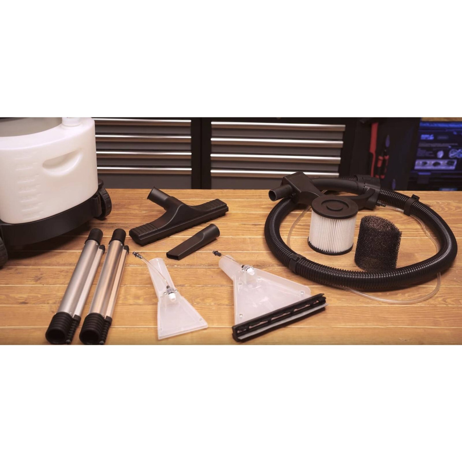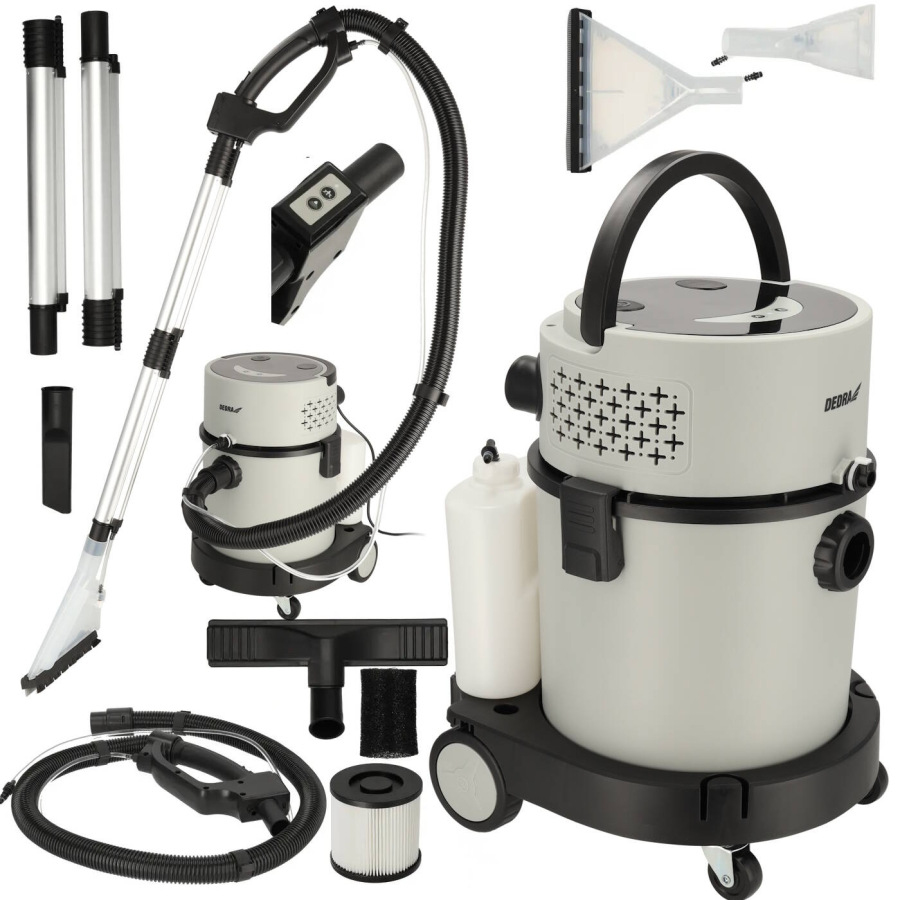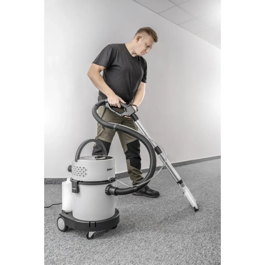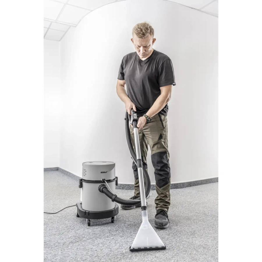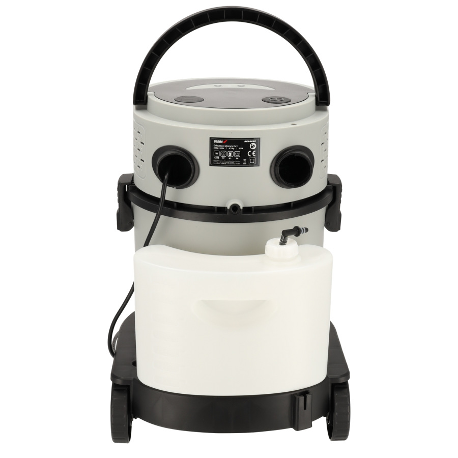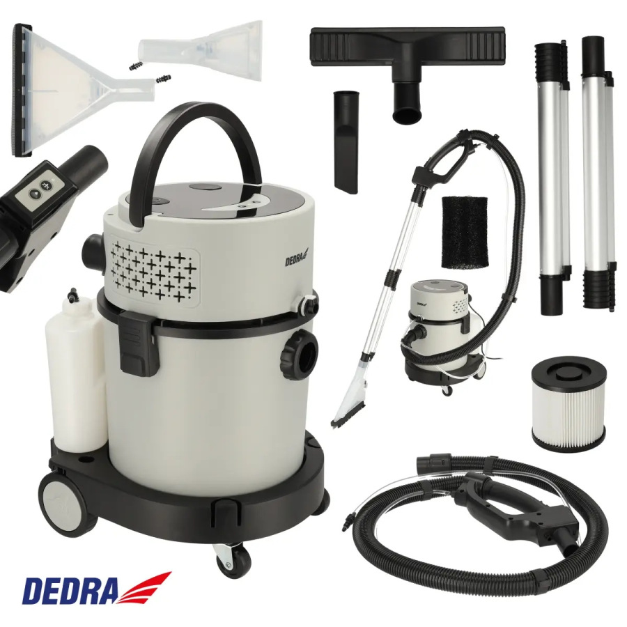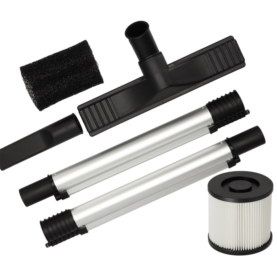 príkon 1200 W, sací výkon 17 kPa, objem nádrže 20 l, dĺžka kábla 4 m, dĺžka hadice 1,5 m, hlučnosť 76 dBA, príslušenstvo: 2 hliníkové nadstavce, kefa na čistenie kobercov, kefa na čalúnenie, štrbinová kefa, mokrá a suchá podlahová hubica, hadica s diaľkovým ovládaním, kazetový filter hubicový filter