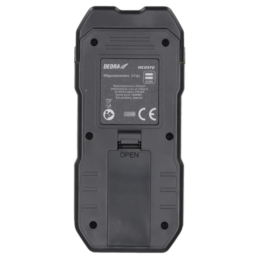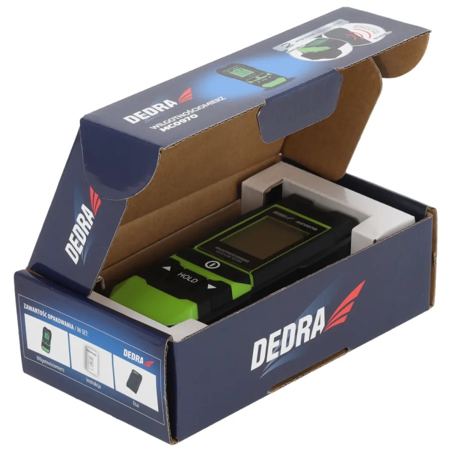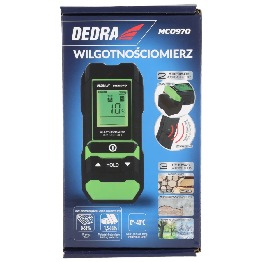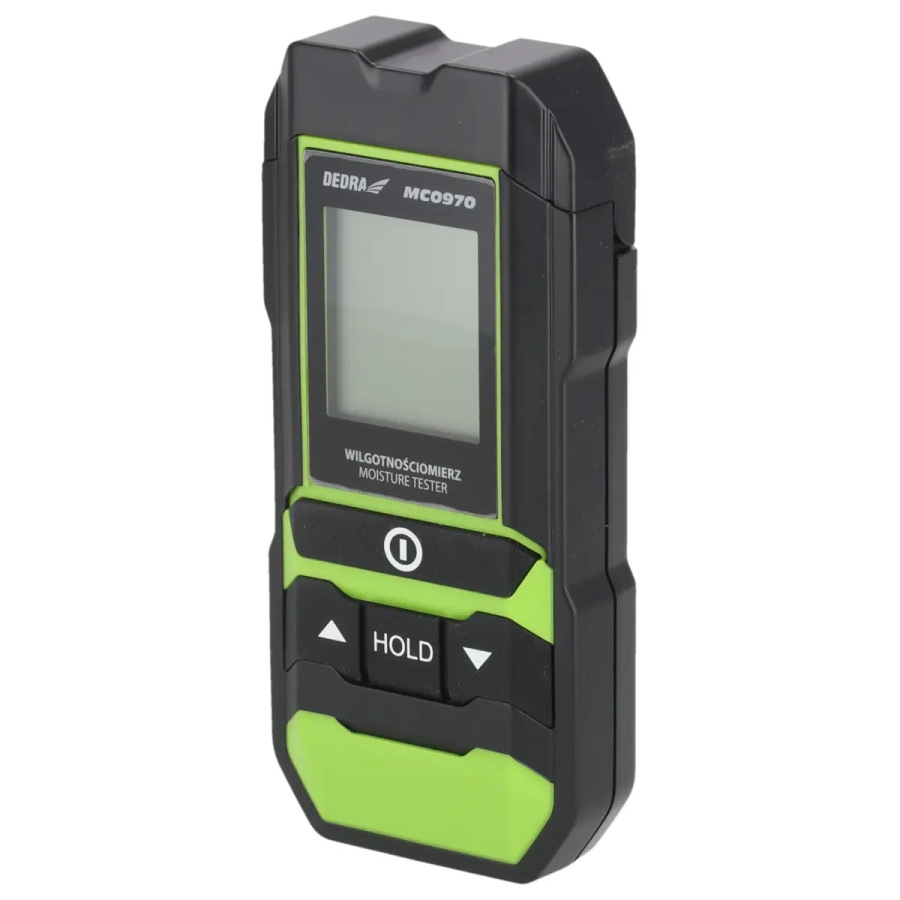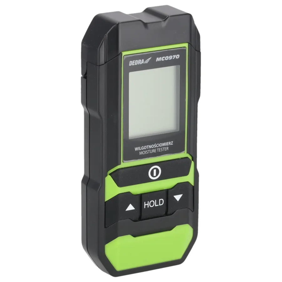 Napájanie: batéria 9 V (6F22); hĺbka merania: max. 20 mm; rozsah merania: drevo - 5-50 %/ stavebné materiály: 0-35%; presnosť merania: drevo ±4/mat.bud: ±2; 3 prevádzkové režimy; 2 metódy merania